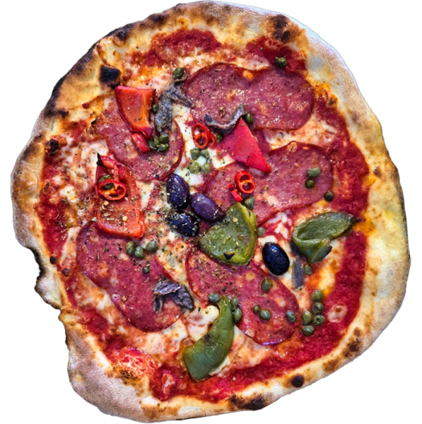 Diavola Tomatensoße I Käse I scharfe Salami I Kapern I Oliven Paprika I pikantes Olivenöl